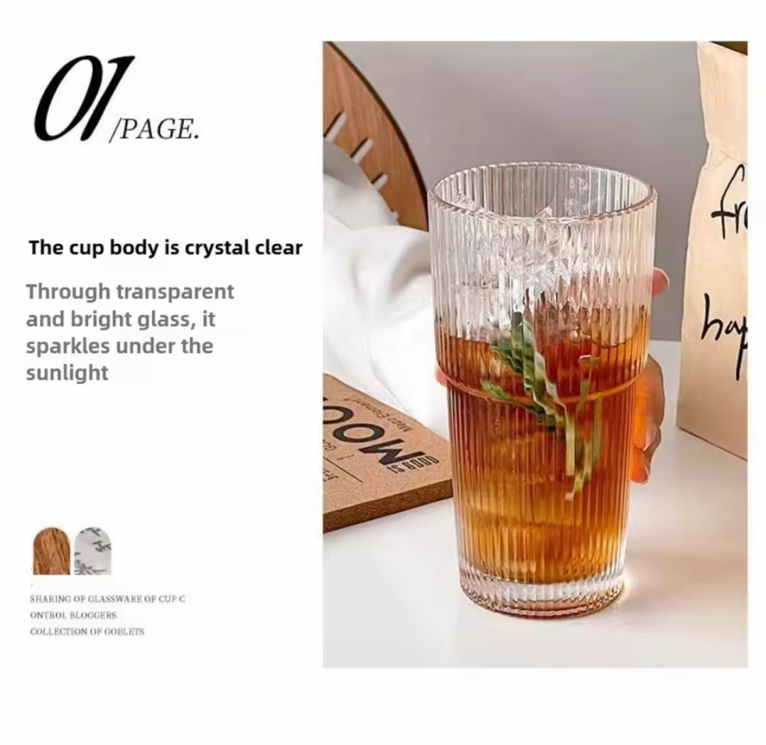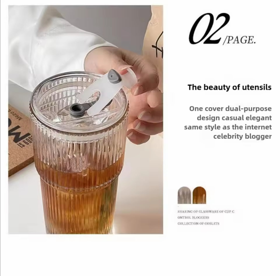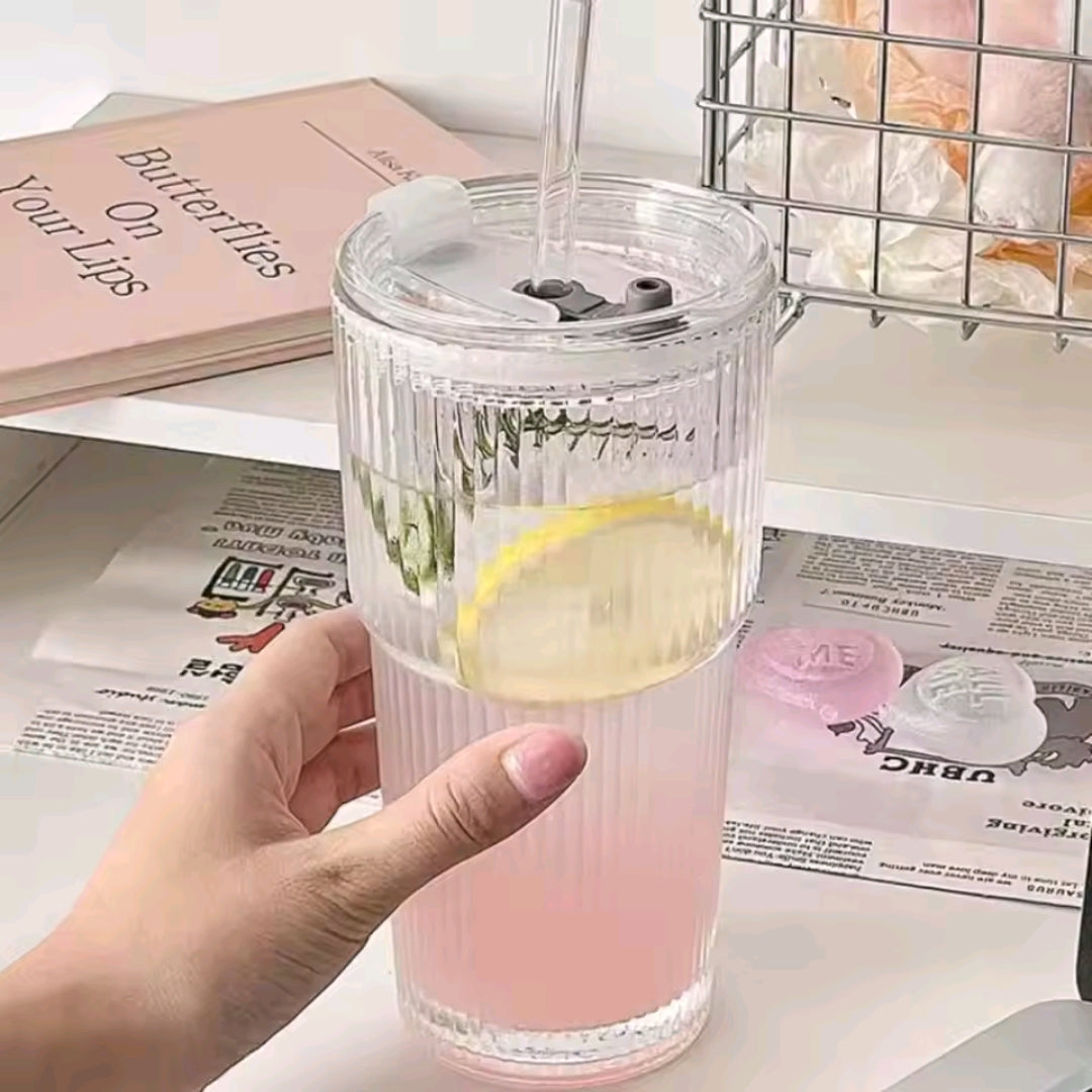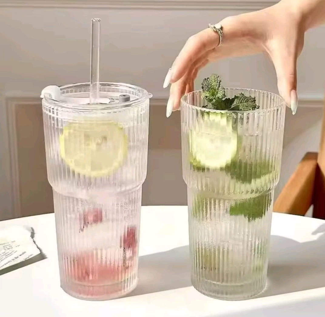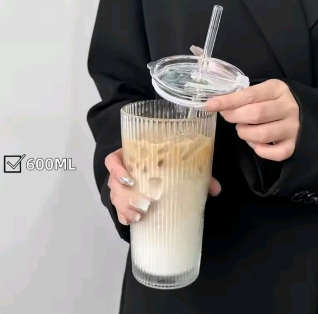 Keywords: ribbed glass cup, iced coffee tumbler, aesthetic glass, 600ml glass, latte glass cup with lid, minimalist drinkware, glass cup with straw, borosilicate tumbler, reusable coffee glass, aesthetic gift.