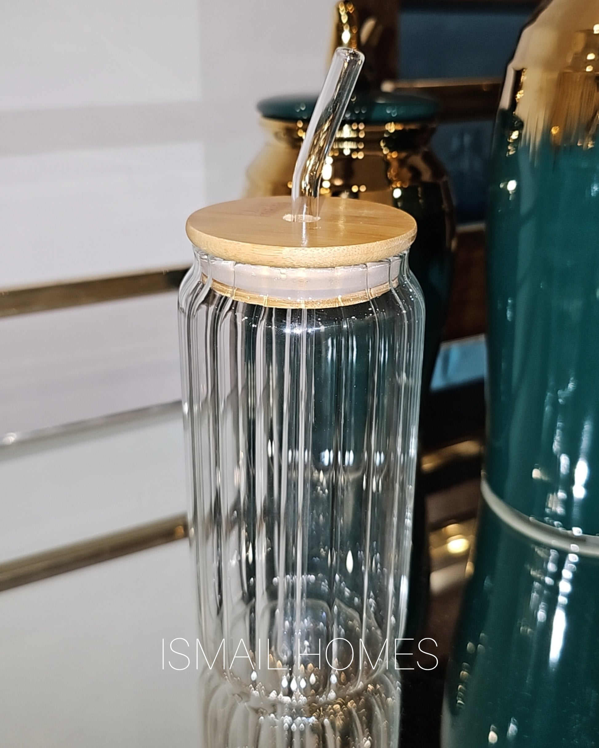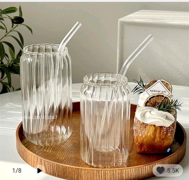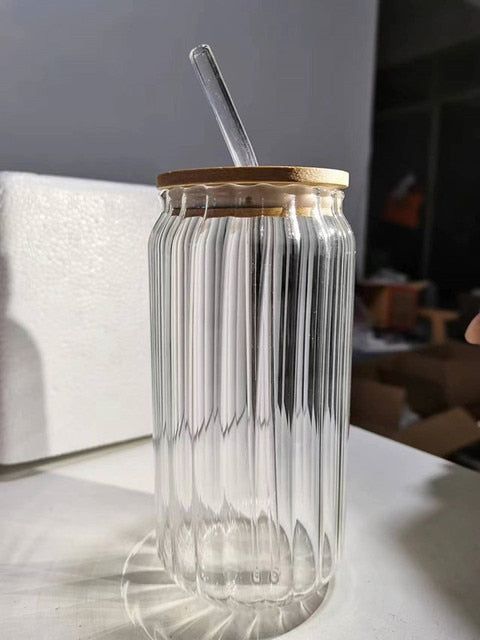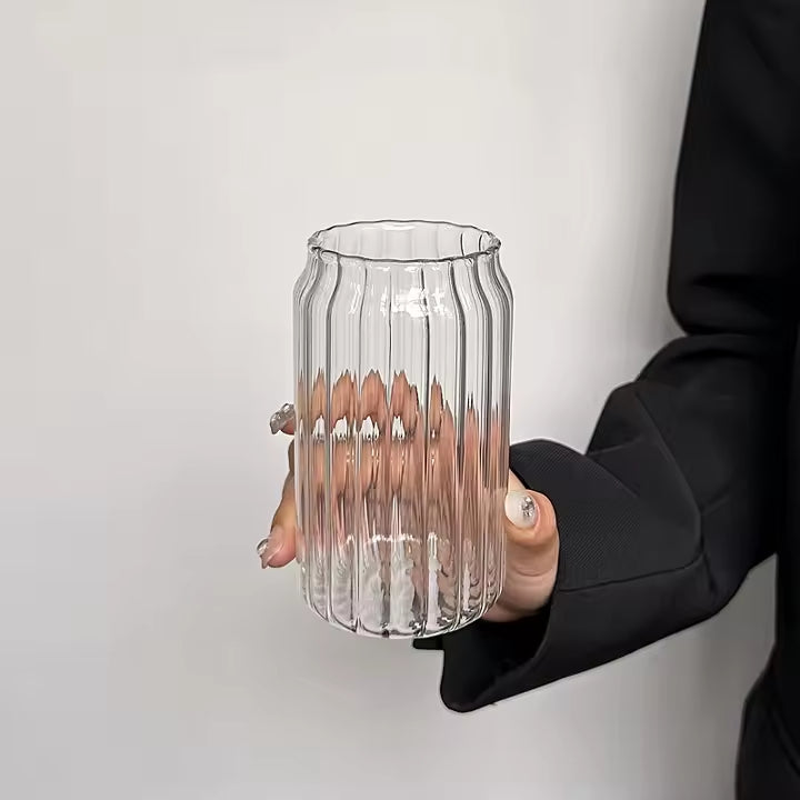 Can Glass Ribbed with Lid and Glass Straw