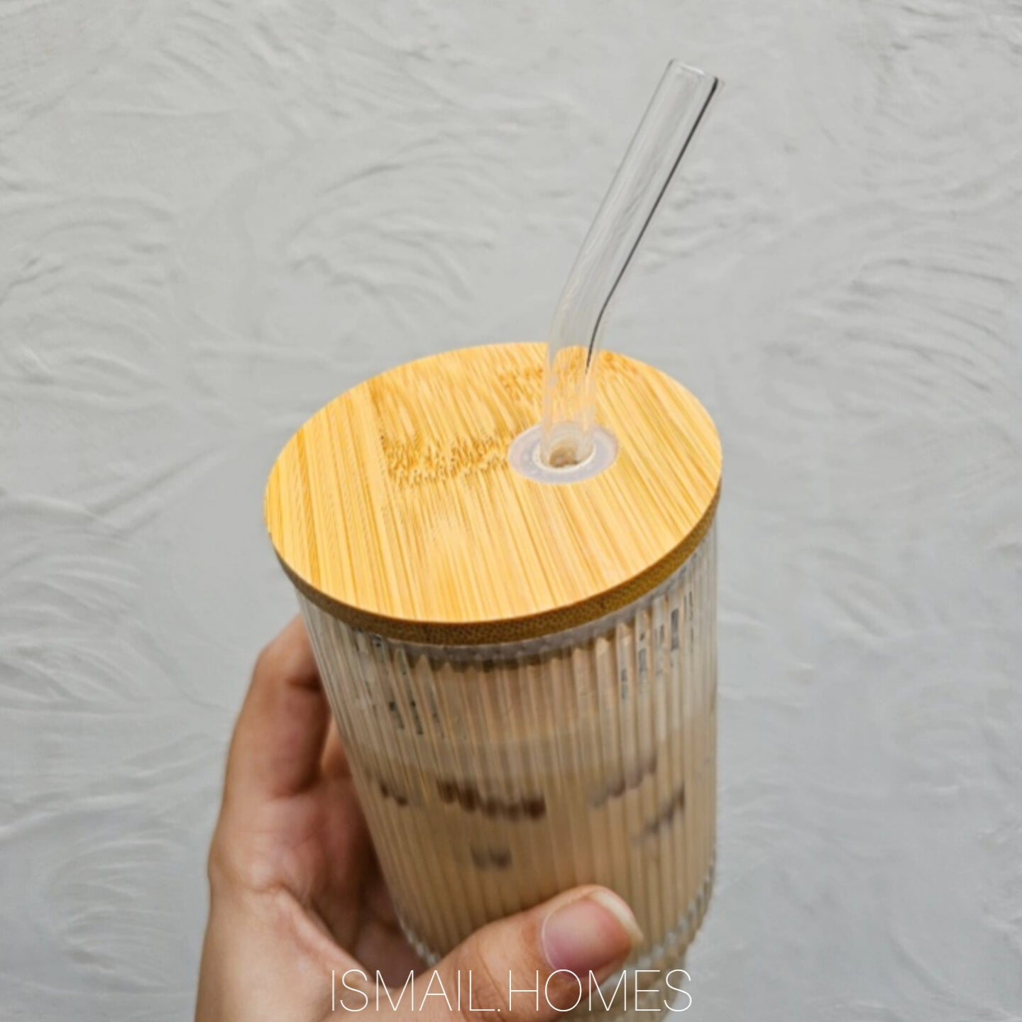 Ribbed Glass with Bamboo Lid and Glass Straw