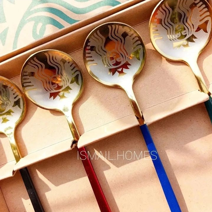 Elevate your dining experience with the Starbucks Dessert Spoon Set. Made of high-quality stainless steel, these spoons come in a set of four with gorgeous gold and color accents. Perfect for adding a touch of luxury to your desserts and drinks. Each spoon measures 15cm*3cm.